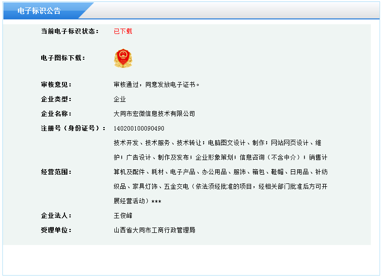 8月30日,宏微信息技術(shù)通過山西省工商行政管理局經(jīng)營性網(wǎng)站認(rèn)證,獲得經(jīng)營性網(wǎng)站“電子標(biāo)識”,工商紅盾標(biāo)識號碼為