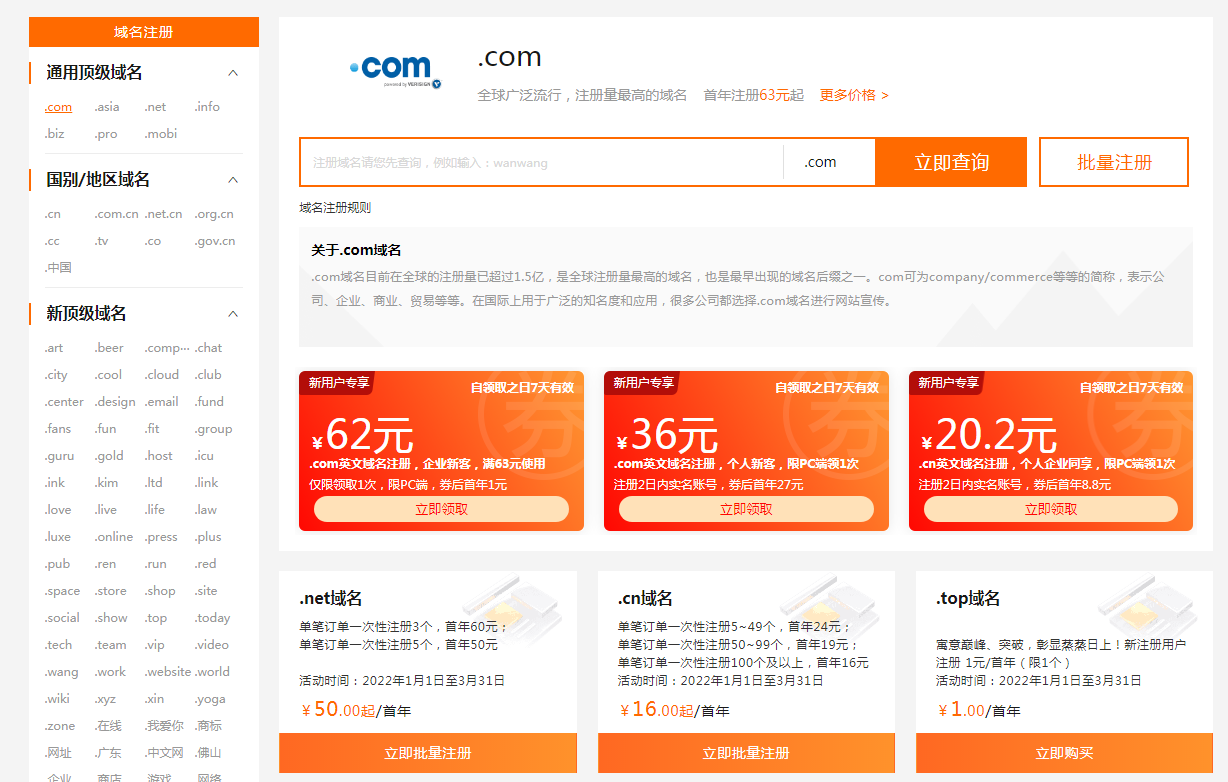 域名(需每年續(xù)費(fèi))  國內(nèi)域名注冊商一共也沒多少家,全國比較知名的就阿里云(以前的萬網(wǎng))、新網(wǎng)這些的,其他小的注冊商幾乎都是這些大公司的代理,域名注冊費(fèi)用每年都在變,但是基本上價格浮動不是很大。