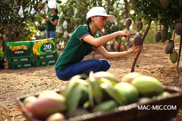 工作人員在采摘記錄芒果生長情況。