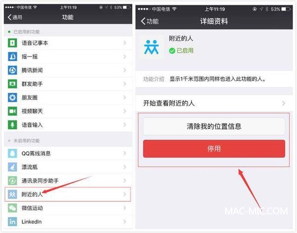 打開微信,依次點擊[我]—[設置]—[通用]—[功能],選擇[附近的人],點擊進去后點擊關閉[清除我的位置信息]和[停用]。