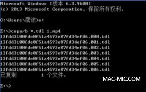 然后使用WIN圖標(biāo)鍵+R ,打開cmd ,輸入   e:  按下回車進(jìn)入e盤 ,然后輸入:copy/b *.tdl 1.mp4   對(duì)E盤下所有tdl格式的文件進(jìn)行合并。